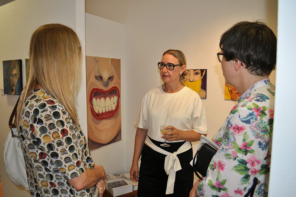 Diese Sichtweise hat auch Sussi Hodel geprägt: Sie wurde 1971 in Dänemark geboren und übersiedelte später mit ihrer Familie in die Schweiz. Dort besuchte sie eine Schule für klassische Malerei und wurde später Meisterschülerin von André de Maertelaere. Heute lebt sie im Kanton Zug und arbeitet als freie Künstlerin. Ihre Werke sind in zahlreichen Privatsammlungen in und außerhalb der Schweiz zu finden. Wie sie bei der Auswahl ihrer Werke hier in der Ausstellung festgestellt haben, sind sie psychologischen Themen bei ihr absolut dominant. Sie ist eine intensive Beobachterin und scheut sich auch nicht davor, bei diesen Beobachtungen auch die eigene Familie ins Visier zu nehmen. So die beiden Töchter mit ihren Streitereien, die Vorlagen zu den sich gegenseitig anschreienden Steinziegen lieferten, das Gemälde hier, das auch als Motiv für die Einladungskarte verwendet wurde.